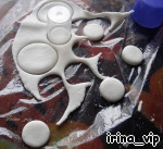 Ещё один нюанс: зубочистку с готовым цветком рекомендуется воткнуть в какой-либо фруктоовощ для дальнейшей просушки. У меня для этого предпосылки отсутствовали. Первое, время поджимало. Второе... Даже при наличии времени ничего бы не вышло в силу недостаточно крутой консистенции мастики. Не выпуская готового цветка из левой руки, правой я вытаскивала зубочистку и ножницами безжалостно отрезала лишнюю мастику. Готовый цветок - в тарелку с сахарной пудрой.