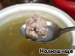 Вынимаем шумовкой луковицы и кладем в кастрюлю фрикадельки.