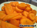 Режем морковку кольцами, если очень крупная морковь, режем колечки пополам. Добавляем к фрикаделькам.