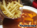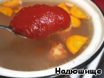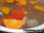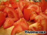 Помидоры нарезаем дольками и еще пополам. Бросаем в суп.