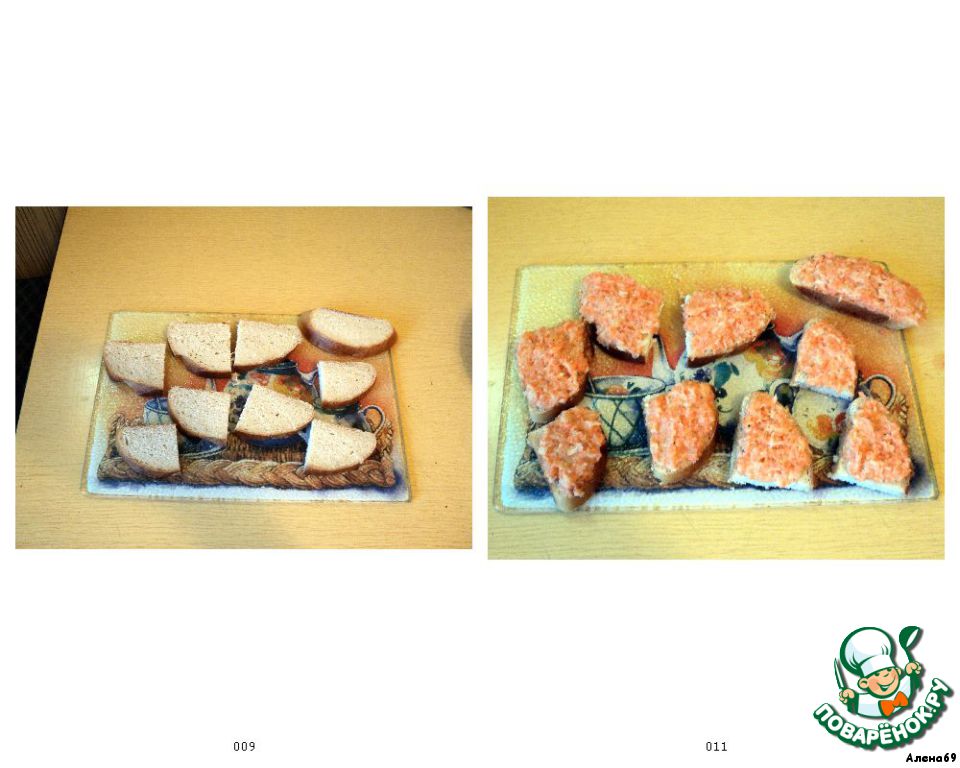 Батон режем на кусочки и смазываем одну сторону хлеба получившейся смесью. Даем постоять пару минут, пока масло разогревается.