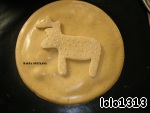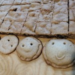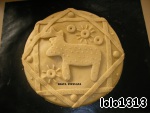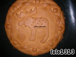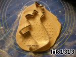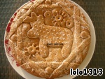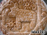Для того, чтобы придать прянику выпуклость я просто вырезала фигурки и полоски, на которые, в свою очередь, для большей рельефности и выпуклости, предварительно после раскатывания теста в пласт, нанесла (на тесто) узорчик из точек с помощью большой кастрюли-дуршлага и деталькой от машинки для резки чеснока..