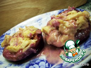 Наполнить этой смесью половинки сливы, положить в небольшую емкость, подходящую для микроволновки. Неплотно прикрыть крышкой и поставить в печь на среднюю мощность (у меня это 400 Wt) на 2,5-3 минуты