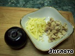 Курицу и сыр смешать с майонезом, немного посолить и поперчить