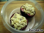 Наполнить этой смесью половинки сливы, положить в небольшую емкость, подходящую для микроволновки. Неплотно прикрыть крышкой и поставить в печь на среднюю мощность (у меня это 400 Wt) на 2,5-3 минуты