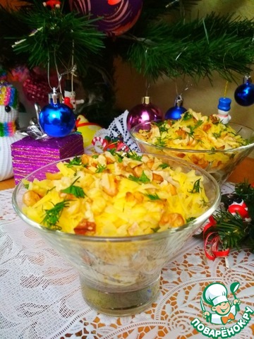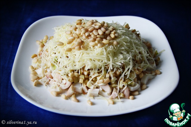 Мне салат не понравился. Продукты вобще не сочетаются, особенно кальмар и сыр, бррр. Жаль только кальмары перевела.