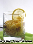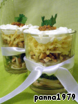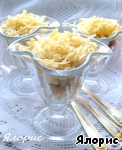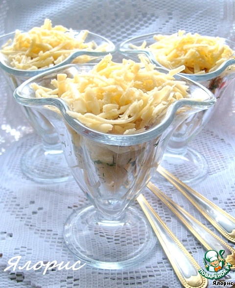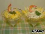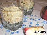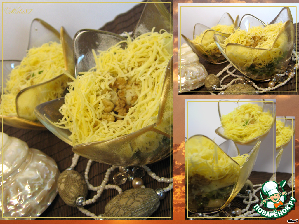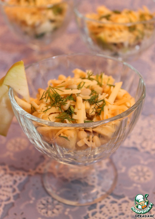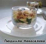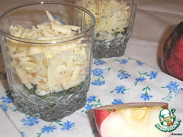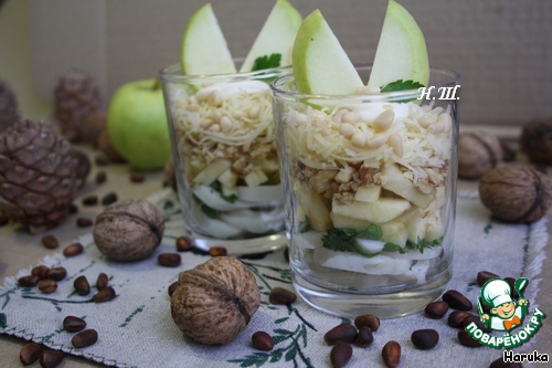 Уложить слоями в салатницы или, как я, в стаканчики (у меня обыкновенные низкие стаканы для аперитива): кальмары - зелень - яблоко - орехи - сыр... В рецепте автор предлагает майoнез, но я заправила салат оливковым маслом и лимонным соком.
