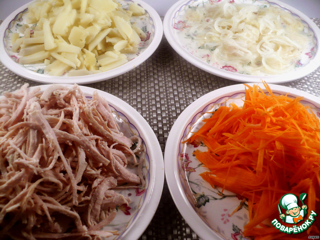 Салат прост до безобразия. Отличительной особенностью является лишь то, что филе птицы разбирается на волокна - чем тоньше, тем воздушнее и нежнее будет салат. Мне попалось какое-то совершенно "неразборное" индюшиное филе. Но курица, как правило, легко делится на тончайшие волокна.