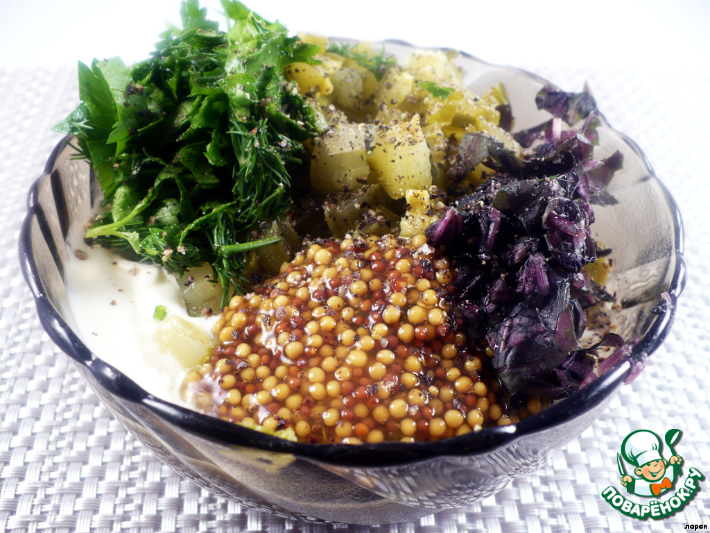 Для заправки смешать сметану (йогурт), зерновую горчицу (можно добавить немного острой, если любите и здоровье позволяет), МЕЛКО нарезанные огурцы, базилик, петрушку, укроп. Попробуйте и выравняйте на соль. Возможно, она и не понадобится, если вам попались слишком соленые огурцы. -