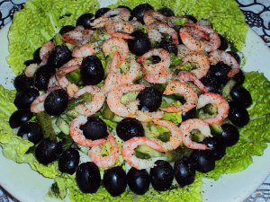 Салат украсить маслинами и отварными креветками, полить соусом и посыпать чёрным молотым перцем. -