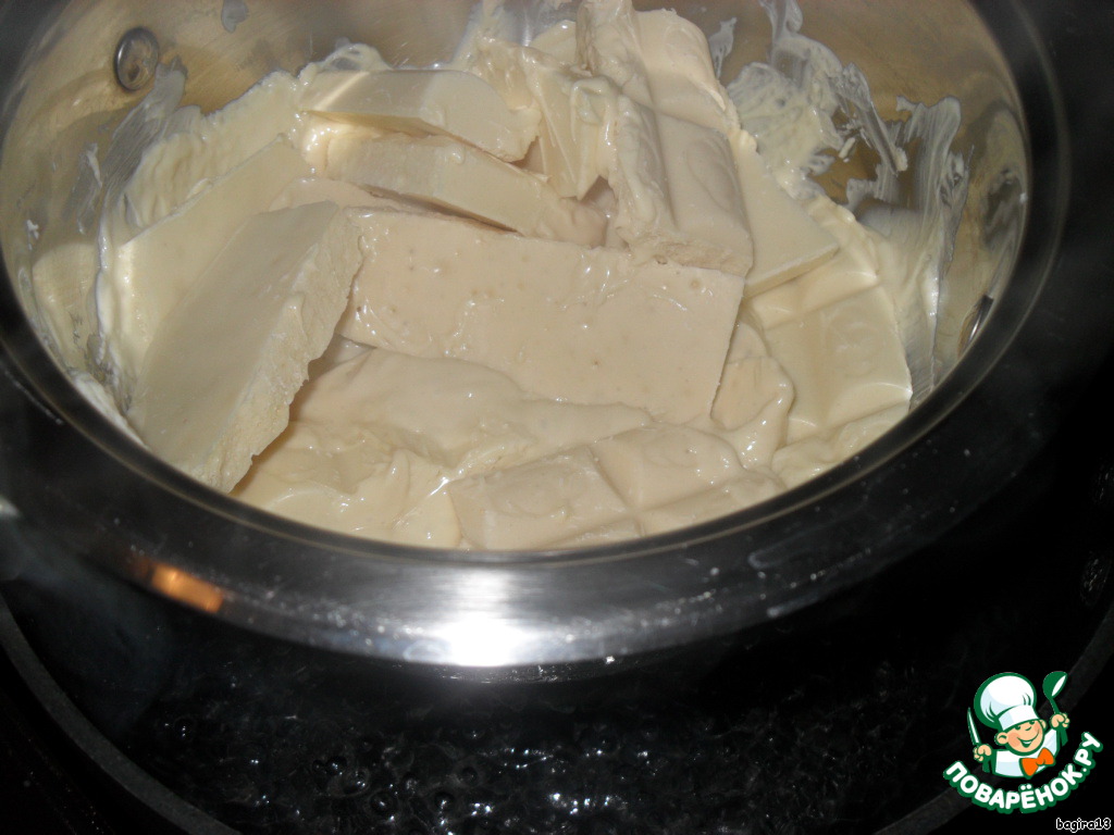 Пока готовится меренга, 250 г белого шоколада растопим на водяной бане и слегка остудим.