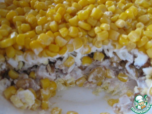 2 слой - куриное мясо. нарезанное кусочками, снова майонез.