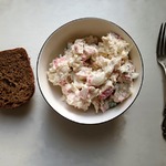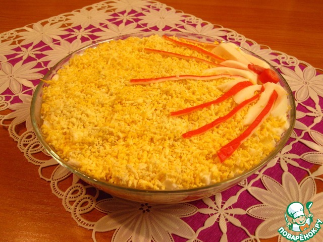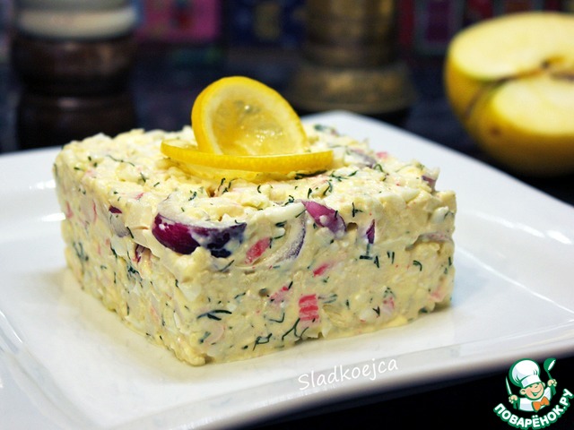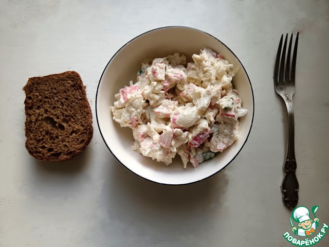 Еще один салат с суррогатным крабовым мясом. Получилось неожиданно вкусно. Очень нежный и легкий. Готовится быстро и непринужденно. Конечно, у кого есть реальная и материальная возможность купить настоящее крабовое мясо - будет гораздо вкуснее.