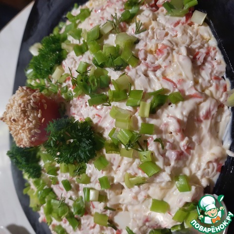 На крабовое мясо - зеленый лук. Можно и репчатый, обдав кипятком.