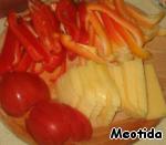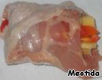 внутрь куриного окорочка кладем перец разного цвета, сыр и помидор