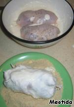 рулетики окунаем сначала в сметанно-яичную смесь, потом обваливаем в сухарях