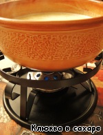 3. Если же фондю расслаивается и никак не желает превращаться в однородную массу, то разводим немного кукурузной муки в небольшом количестве вина или шампанского, добавляем капельку лимонного сока, вливаем эту смесь в фондю. Переносим горшочек на горячую плиту и снова доводим до кипения, основательно перемешивая.
