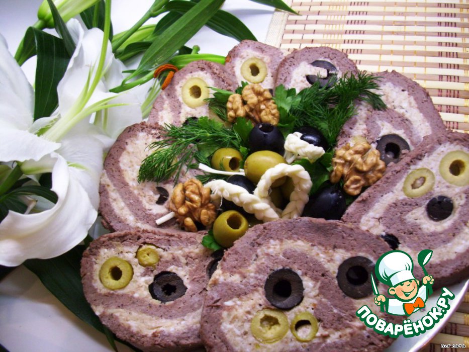 Выложить на блюдо и украсить. У меня в качестве украшения: целые оливки и маслины, цельные грецкие орехи, свежая зелень и косички из сыра-спагетти