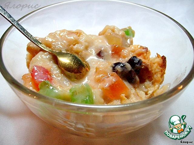 А это фото варианта десерта, который подавали в одном из ресторанов. Как видите, здесь орехи добавлены только сверху, а сухофрукты отвариваются в малом количестве воды и подаются отдельно. Вместо сгущенки используются молоко и сливки, но к ним добавляется еще 100г сахара.