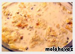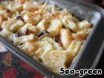 Духовку разогреть до 200 градусов. В огнеупорную емкость выложить смесь, положив на дно пару кусочков масла. Сверху равномерно распределить сливки.