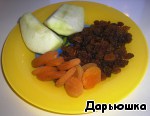 Подготовим яблоко и сухофрукты. Яблоко лучше брать жесткое, чтобы сохранило форму. Яблоко режем кусочками, курагу - мелко.
