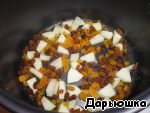 Выкладываем в кастрюлю от мультиварки масло, затем яблоко, курагу, изюм.