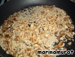 На сухой сковороде прокалить орехи и кунжут. В оригинальном рецепте нужно добавлять крэш (черные большие семечки), но я их не люблю, поэтому заменила на фундук. Вместо грецких орехов можете взять кедровые орешки.