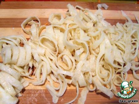 Смешать яйца, крахмал, масло, немного посолить и испечь тонкие блинчики. Когда они остынут, нарезать их тонкими полосками.