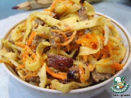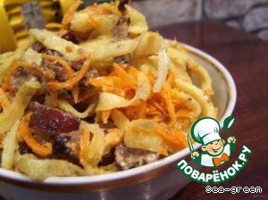 Я к Вам снова с салатиком, в котором прекрасно сочетаются куриная печень, блинчики из крахмала, морковь и интересная заправка. Заходите, угощайтесь!
