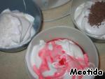 в одну добавляем кокосовую стружку, в другую - клубничный сироп, в третью - тертый шоколад -