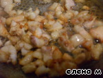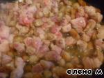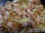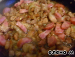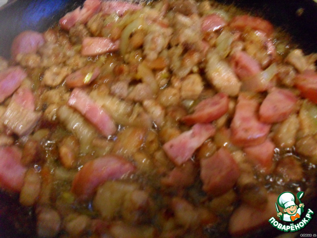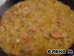 Когда лук приобретёт золотистый оттенок, добавляем колбасу, добавляем соль, перец, кориандр, майоран и лавровый лист, жарим пару минут.