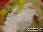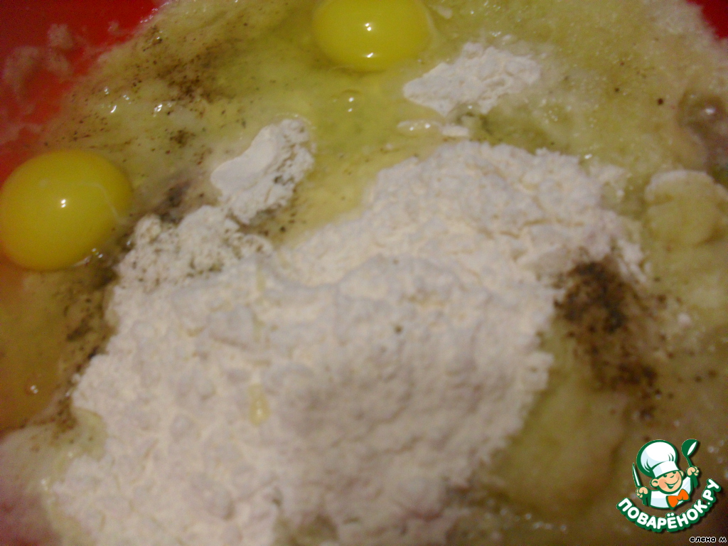 Убираем лишнюю жидкость, добавляем соль, перец, яйца, 2 ст.л. муки.
