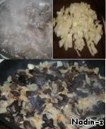 Грибы выложить на сковороду, выпарить влагу, добавить масло растительное и крупно нарезанный лук, пережарить до золотистой корочки лука