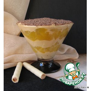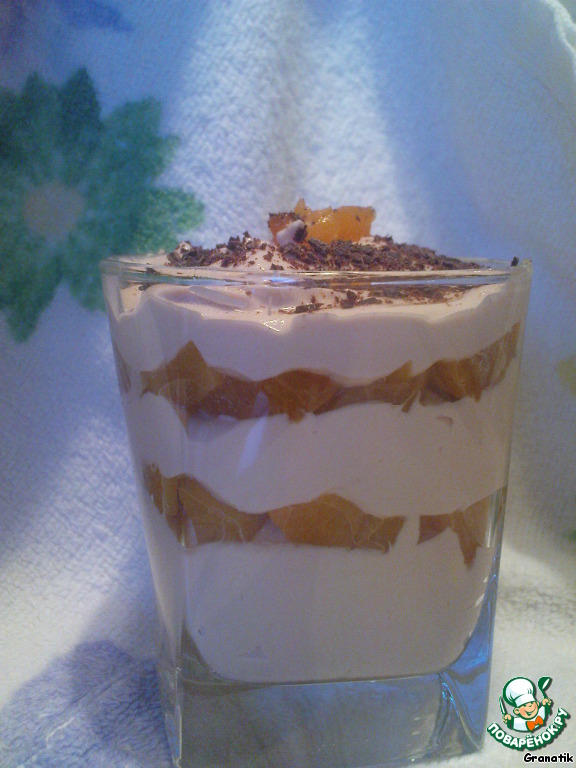 В четыре широких стакана или креманки выкладываем слоями попеременно кофейный творог и кусочки персиков.