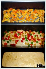 В форму для выпечки хлеба с тефлоновым покрытием выложила на дно курагу (не смазывала маслом). Затем выложила часть теста. На тесто равномерно разложила цукаты. Потом выложила остатки теста.