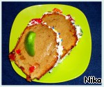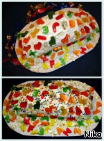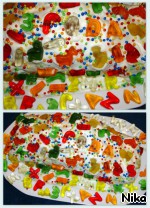 Духовку разогрела. Поставила кекс выпекаться на 25 минут при температуре 180 градусов. Кекс подрумянился. Проткнула его посередине палочкой, чтобы посмотреть, пропёкся или нет. Готовый кекс на 30 минут выставила на балкон... Взбитый яичный белок пока постоит в холодильнике... Кекс остыл. Теперь можно украшать. Обмазала белком. Очередь за жвачками и тянучками.