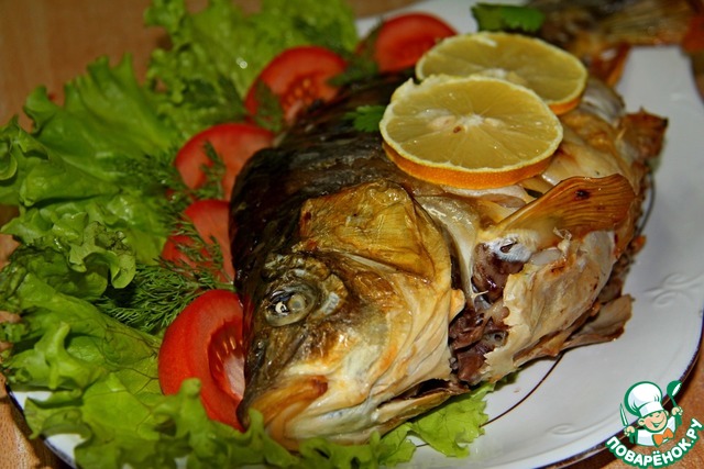 На карпе сделать надрезы, вложить в них ломтики чеснока. -