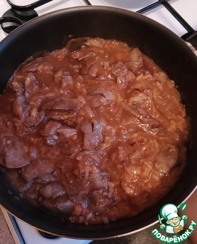 Добавляем соус к печени, тушим 3-4 минуты. Если надо, соль, перец - по вкусу.