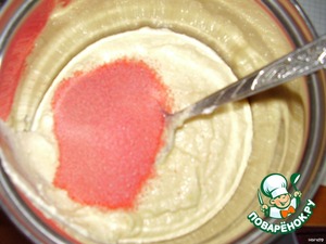 Смешать ингредиенты для теста. Хорошо размешать и разделить на три части (примерно равных). В одну добавить пакетик пудинга или сливок.