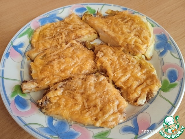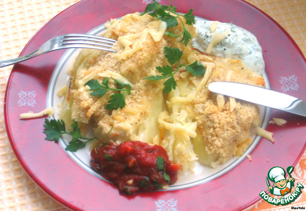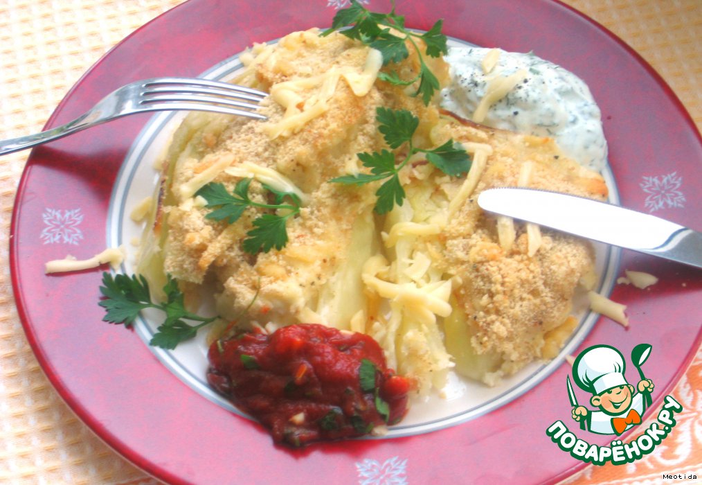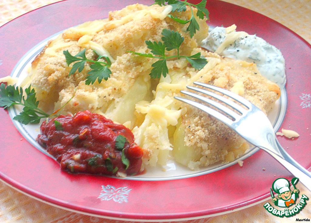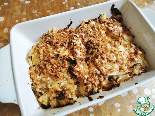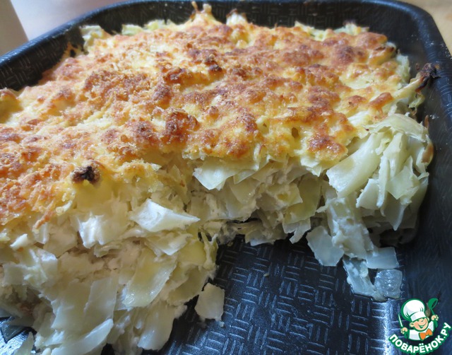 Пролистав несколько десятков сайтов с этим рецептом, пришла к выводу, что сложно понять кто первый скопировал текст и поместил его в интернет, но явно никто не потрудился приготовить это довольно-таки интересное и необычное блюдо... Состав ингредиентов прост, приготовление элементарное.. а получается сытное овощное блюдо, с сырно-сметанной прослойкой.. с хрустящей сухарной корочкой.. Мне понравилось макать кусочки капусты в белый и красный соус, но тут дело вкуса и Ваших предпочтений.. Рецепт этого блюда был размещен на сайте в 2008 году пользователем lesi под названием "Капуста по-румынски" и иллюстрирован мной в рамках акции "Раскраски".