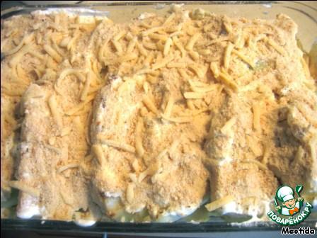 Поливаем сметаной и посыпаем сухарно-сырной смесью.