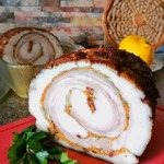 Затем ставим кастрюлю на огонь с добавлением луковой шелухи и воды, когда все хорошо закипит, добавляем соли на один литр - полный сто граммовый стакан (3 литра - 3 ст.) кладем в кастрюлю наш рулет и варим с момента закипания 1 час, сделав несколько проколов в рулете.