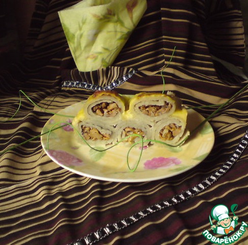Для заливки смешать молоко, сметану, раздавленные зубчики чеснока, залить рулеты.