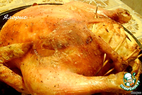 Заколоть отверстие зубочистками и запекать в духовке 1 - 1,5 часа при 200 - 230 гр.