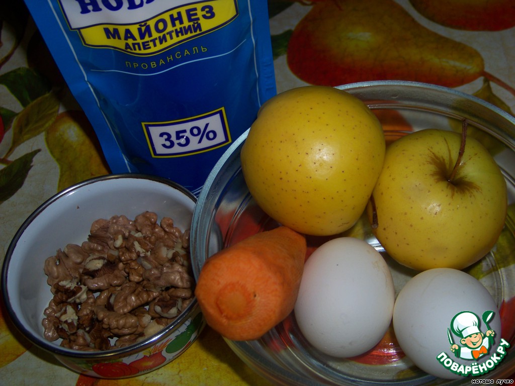 B салатник трём на крупной тёрке 1 очищенное яблоко и сверху майонез.
