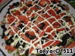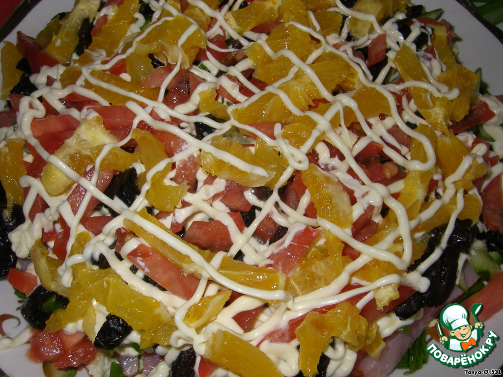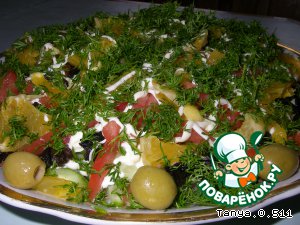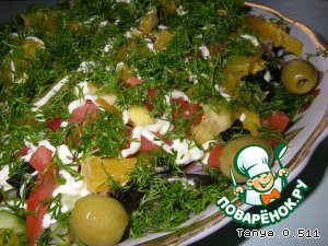 Очень вкусный и яркий салат! Красиво смотрится на праздничном столе! Рецепт этого блюда был размещен на сайте в 2009 году пользователем Tanya. O. 511 (то есть мной) под названием салат "Любимый" и иллюстрирован мной в рамках акции "Раскраски"