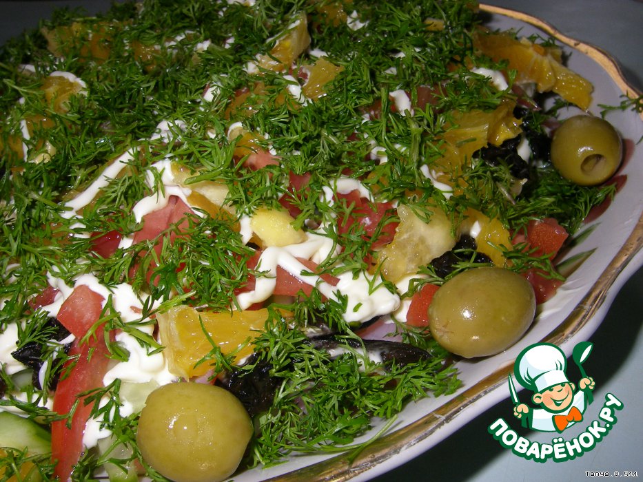 Капусту мелко нашинковать; балык, огурец, помидор, чернослив (предварительно распарить) и апельсин нарезать тонкими полосками. Зеленый лук и зелень укропа мелко нарезать. -