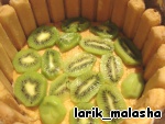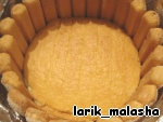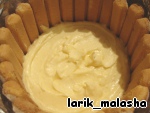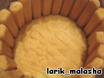 На блюдо выложить корж. На него поставить кольцо для тортов (разъемная форма). Вокруг поставить заборчиком бисквитное печенье (закреплять его между формой и бисквитом).