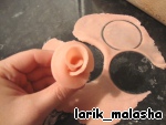 Теперь приступаем к изготовлению цветов: готовый марципан тонко раскатать на столе, посыпанном кукурузным крахмалом. Стаканом вырезать кружочки. Один кружок скатать рулетом, а на него накладывать лепестки.