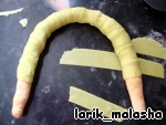 Теперь готовим ручку корзинки: смешать 1 белок, 2 ст. л. молока, 1 ч. л. сахара и примерно 6-7 ст. л. муки. Замесить тесто, похожее на дрожжевое по консистенции.